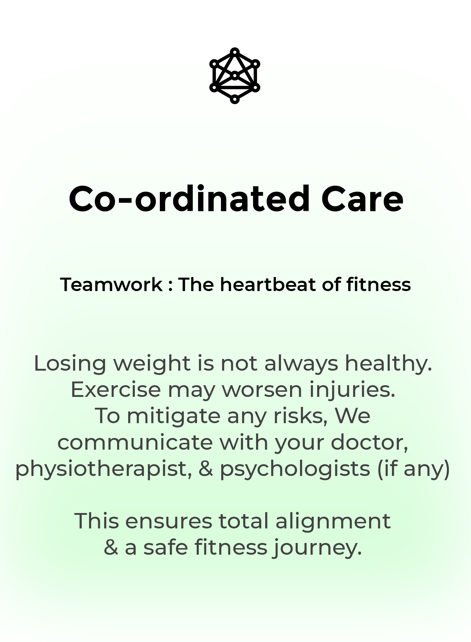 Coordinated care: We coordinate with your doctor, to ensure there is alignment between your health and your fitness journey. We share your progress report which can be monitored by your doctor to track progress.